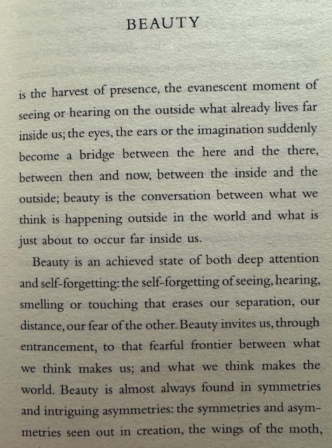 McGilchrist argues that beauty is universal—there is no formula for it, it can’t be commanded. It has to be experienced, and in that experience we become “aware of being the presence of something greater than ourselves.” This perspective resonates with Whyte’s idea of beauty as an invitation to deep relational engagement—necessitating vulnerability and humility.