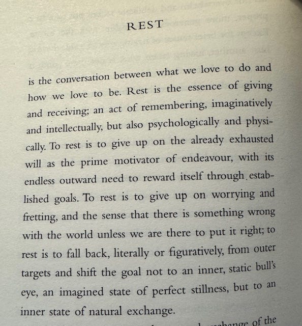 In Consolations, Whyte reframes rest as an essential act of reconnecting with life’s rhythms. It’s not just the absence of activity but a deep, embodied experience of letting go and returning to ourselves. In this understanding, rest is not passive but an active reengagement with life and our surroundings. We are to feel what rest means, and make it part of our lived experience.