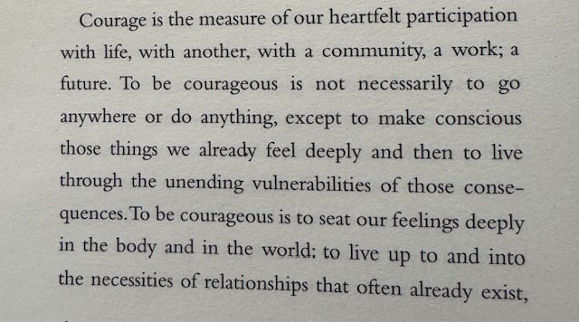 Similar to beauty, Whyte also roots courage in a heartfelt participation with life, an active engagement with relational depth and our vulnerabilities. He rejects the notion that courage is about dramatic action; instead, it’s about living with integrity and presence in the face of uncertainty. Courage, for Whyte, is deeply embodied and tied to the “necessity of relationships.” It requires anchoring ourselves in the present: within the body, within our communities, and allowing connection and care to guide us.