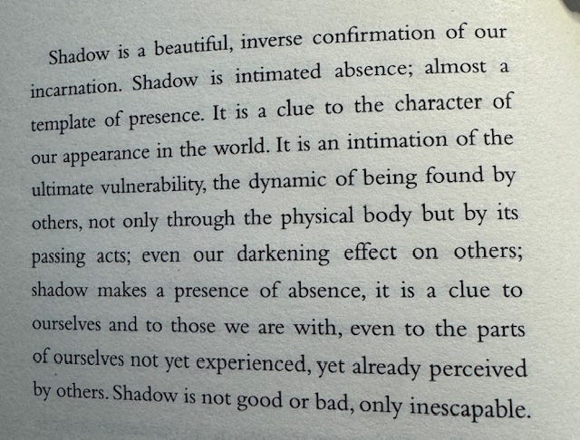 Whyte calls shadow a “presence of absence,” representing the unseen parts of ourselves that shape how we appear in the world. Shadow is inescapable, a reminder of our ultimate vulnerability and interconnection with others. It’s not good or, as we typically like to think, bad, but rather essential and human.