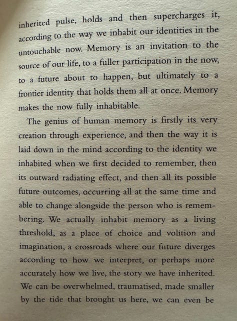 Wythe brilliantly describes memory as a “living threshold”—a crossroads where chance, choice, and imagination converge. It is deeply relational, shaped not only by what we remember but also by how we reinterpret those memories in the context of our lives and our believed identity and attitudes. Memory in that understanding ties the present to both past and future: if we participate fully in the present, we connect to the unfolding possibilities of the future—and this, I find, is such a transformative insight: Memory is both a psychological act (we can make peace with past negative beliefs and trauma) and a creative act. We can orchestrate our remembering, through the feelings in our heart. We are not locked in the past; memory has the potential to transform us and vice versa (I wrote about ‘The Art of Memory” in an earlier essay here).